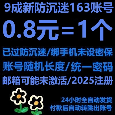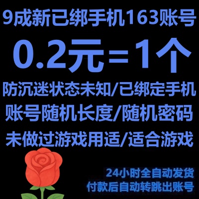 9成新2025年注册账号(随机密码)----单独佣有/全新163邮箱/邮箱可能未激活/已防沉迷163账号/账号长度随机/绑定手机/未设密保/适合游戏