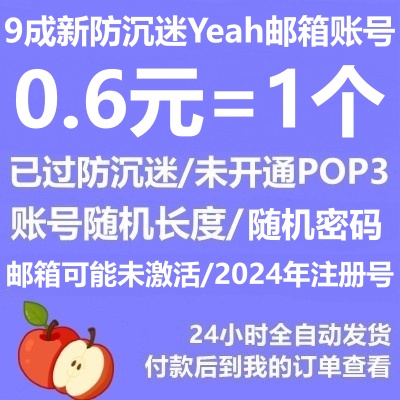 2024年注册(统一密码)----9成新yeah邮箱/邮箱可能未激活/已防沉迷163账号/账号长度随机/绑定手机/未设密保/适合游戏