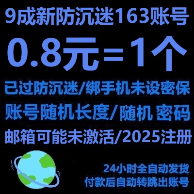 9成新2025年注册账号(统一密码)----单独佣有/安全可靠/已防沉迷163账号/账号长度随机(普便6-9位)/绑定手机/未设密保/适合游戏